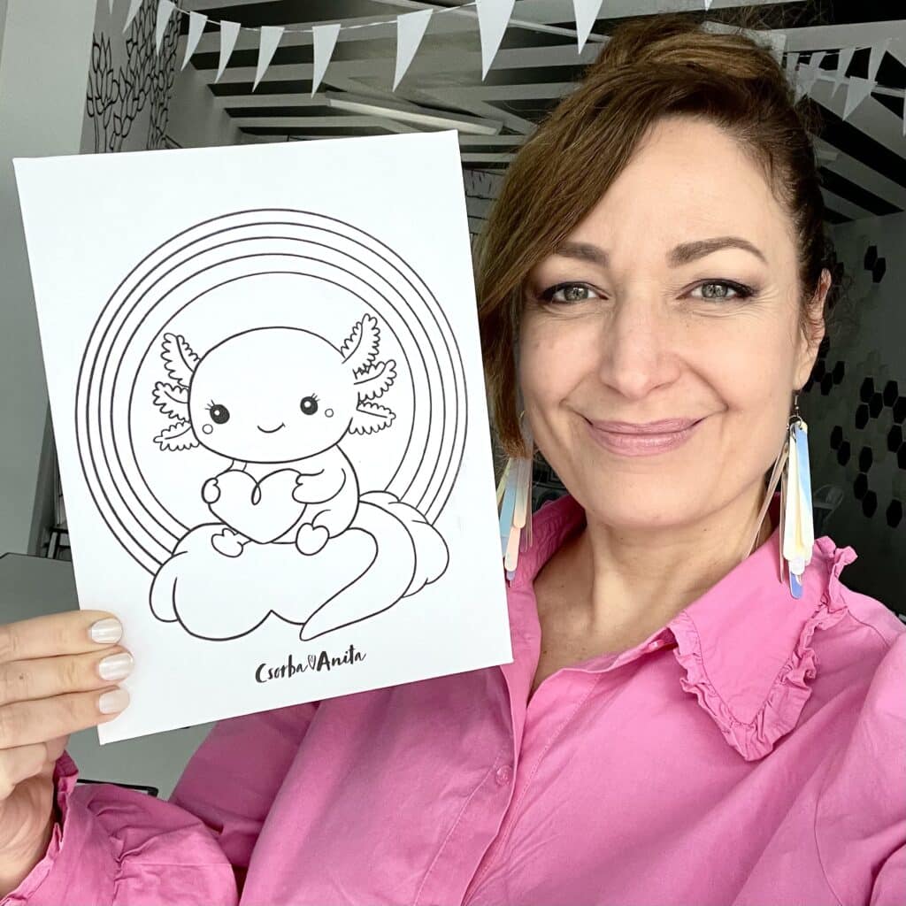 🐉Az axolotl sem maradhatott ki a buliból! Ezt találjátok Anita által megrajzolva, vászonra nyomtatva – ezt tudja gyermeketek a festékekkel kidekorálni, amelyet szintén tettünk a dobozba.