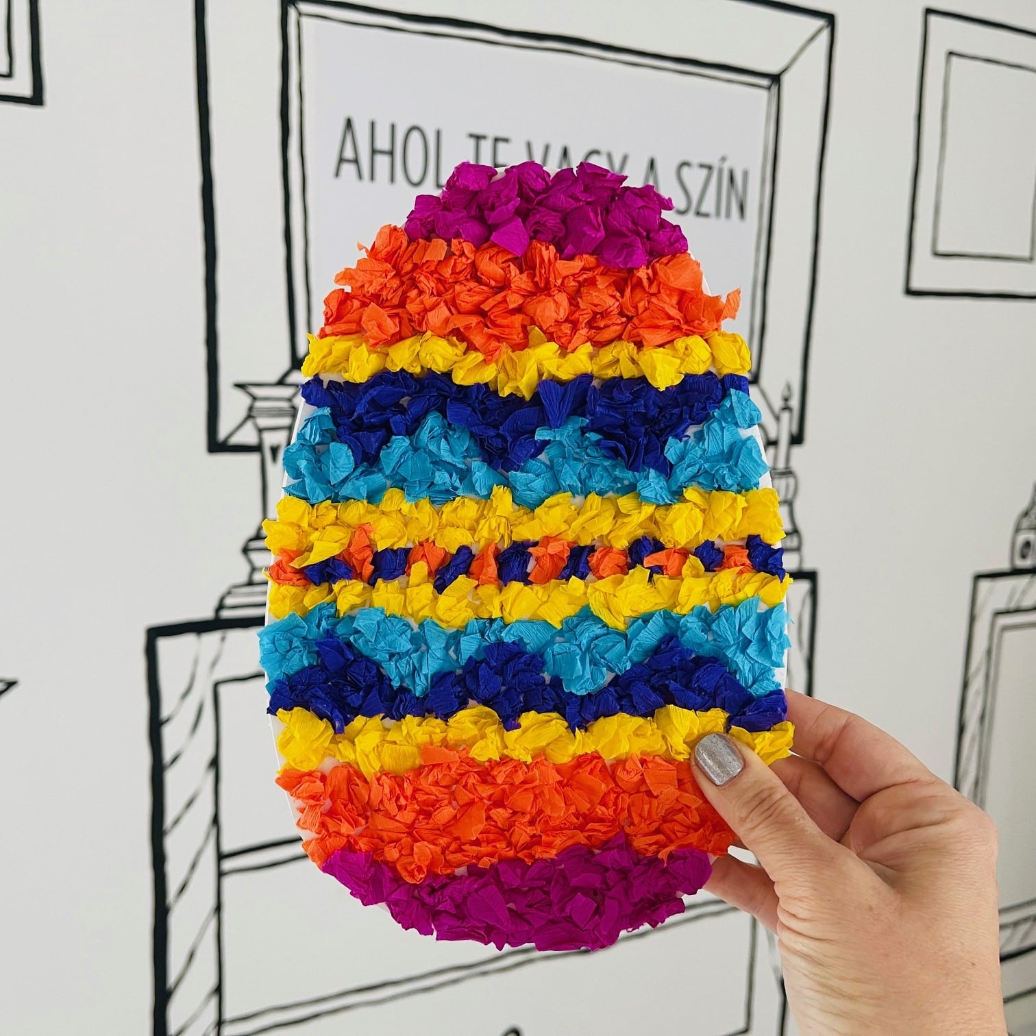 🎁És akkor az ajándék: a képen látható húsvéti tojást tudja elkészíteni a doboz boldog tulajdonosa, ehhez pedig mindent kiküldünk a dobozban: a habkarton tojásalapot, és a csodás színű krepp papírokat is, amelyeket gyűrögetve tudtok ráragasztani az alkotásra.