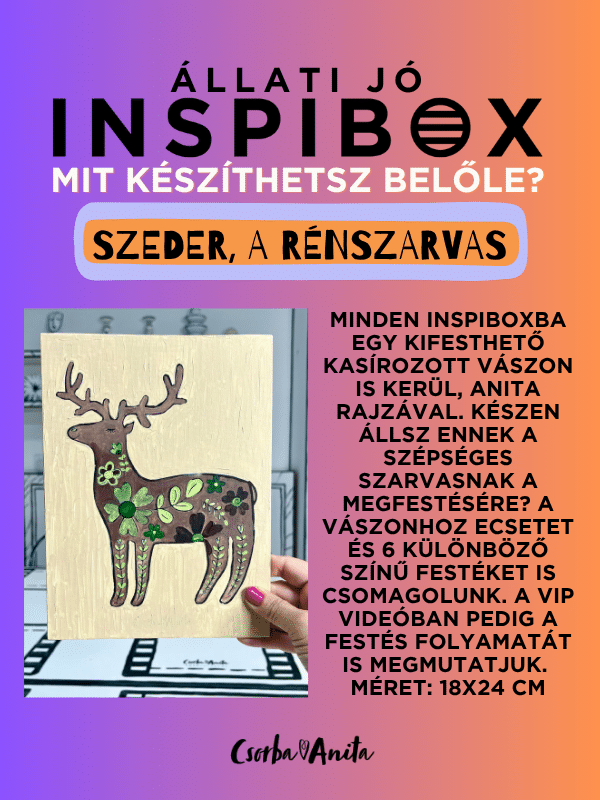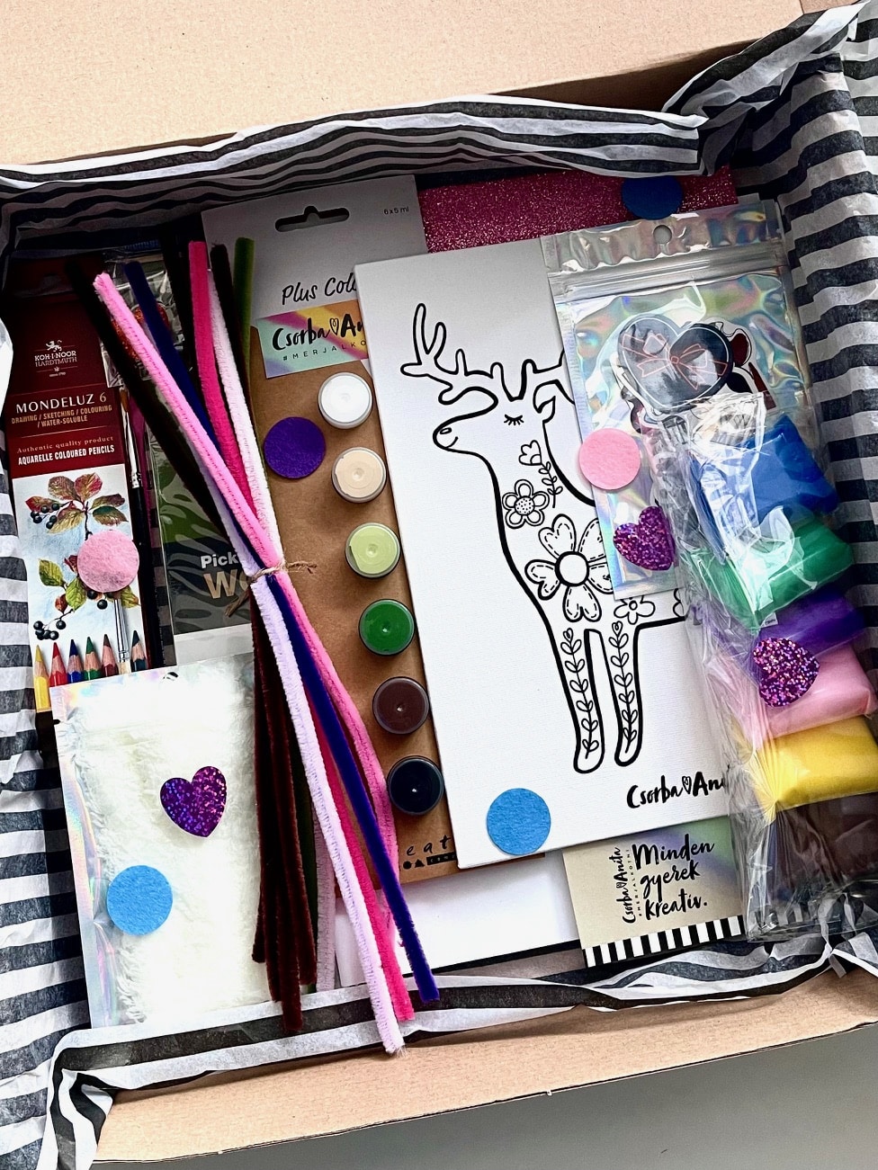 🦌Vászonra ezúttal egy csodás szarvas került, aminek bájos mintáit élmény lesz kifesteni – az ehhez szükséges festékszett és professzionális ecset is ott lapul a dobozban.