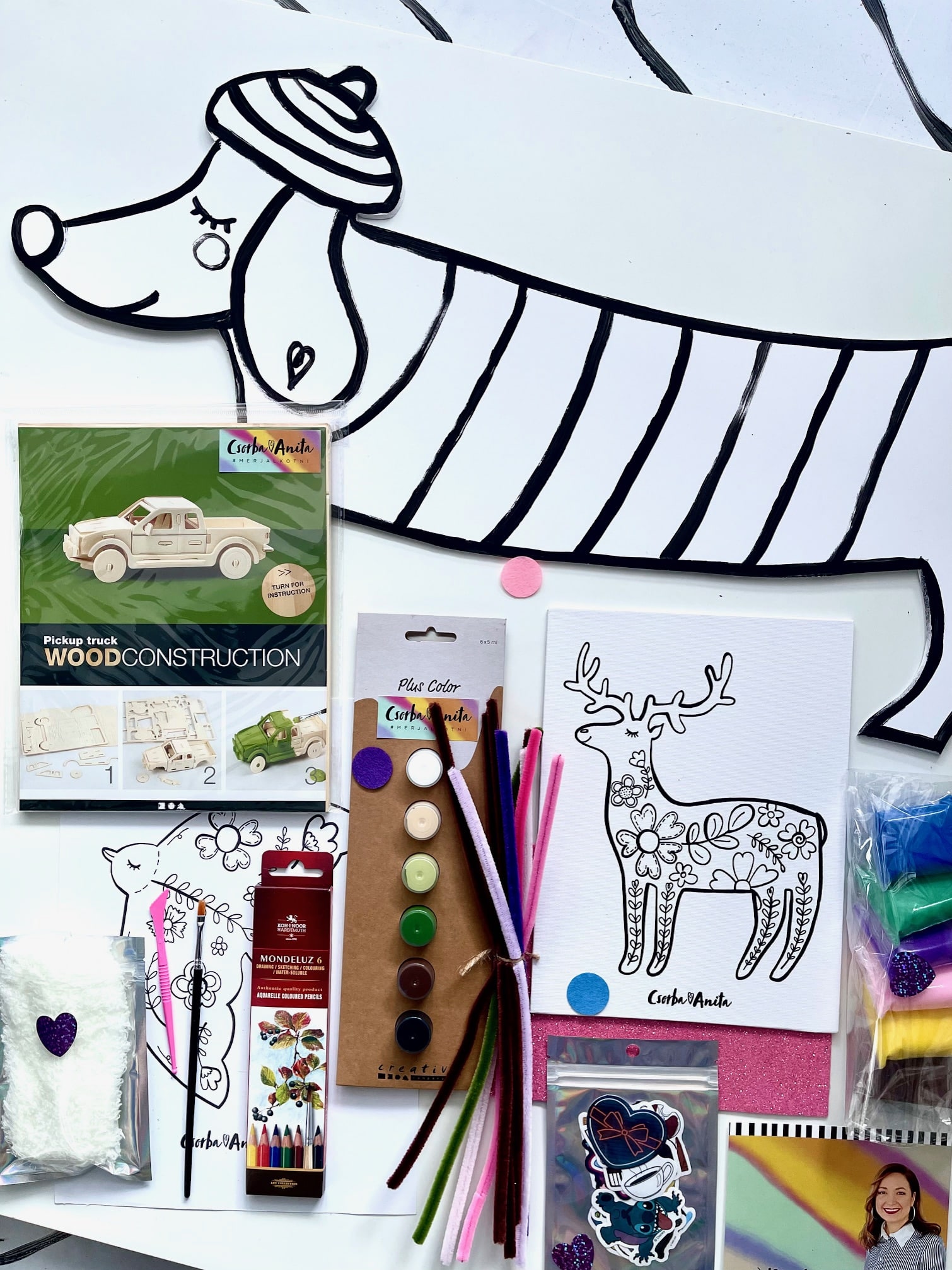 🐕Találtok a dobozban egy általam rajzolt, 60 cm-es tacskót, habkartonra felfestve – ehhez hat darab, levegőre száradó gyurmát, és egy gyurmaformázó eszközt is tettem a dobozba. Ezek, és persze a VIP videó segítségével fogja tudni gyermeked megalkotni új házikedvencét.