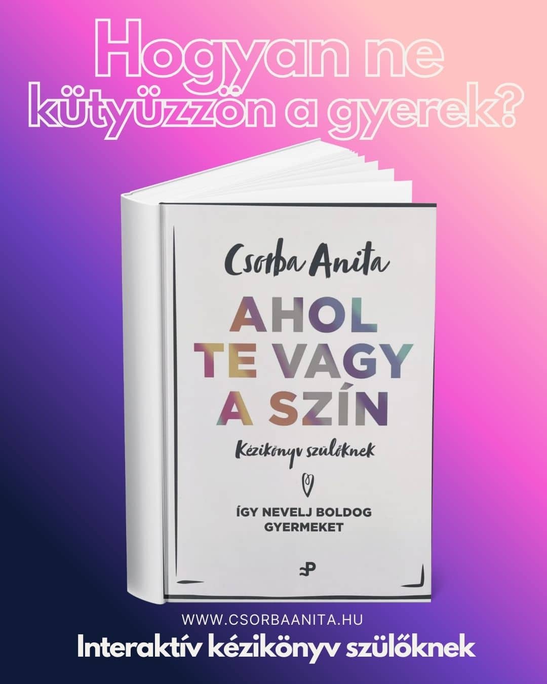 Csorba Anita: Ahol Te vagy a szín – Kézikönyv szülőknek, amely azért született meg, hogy segítsenek a szülőknek boldog gyermekeket nevelni a kütyük uralta világban. Saját tapasztalatok, tudományos háttér, játékgyűjtemény és feladatok – kézzel fogható segítség, amely kapaszkodó lehet minden anyuka és apuka számára.