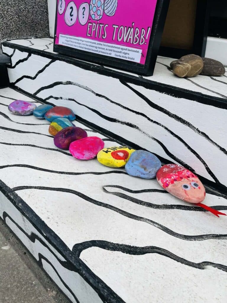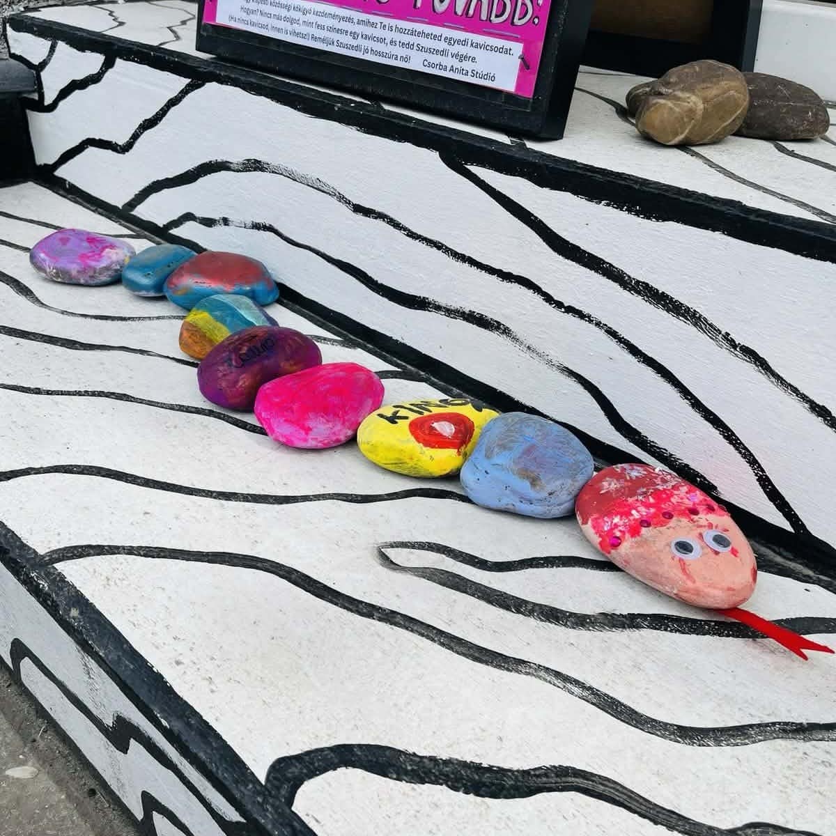 🩷Hogyan járulhattok hozzá Szuszedli növekedéséhez? Fessetek ki tetszőlegesen egy kavicsot, hozzátok el a Csorba Anita Stúdió elé, és tegyétek a kavicsot az utolsó kavics mögé. Ha kavics nem áll a rendelkezésetekre, először hozzánk látogassatok el: tettünk ki pár darabot, amit haza lehet vinni és kidekorálni, hogy Szuszedli szép, színes kígyóra nőjjön. Nézzétek meg, hol tart most: